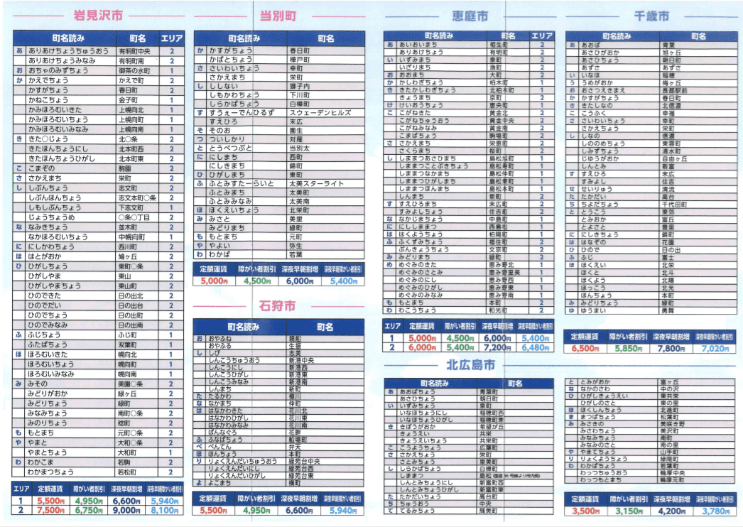 岩见泽 2 | 大和1条~5条、南町1条~9条、美園1条~8条、駒園、緑丘、春日町、並木町、東山、鳩丘、若駒、枫町、日之出町、日之出南、日之出北、日之出台、有明町南、有明町中央、東町1条~2条、元町1条~3条、北本町東、北本町西、稔町、緑町、西川町、1条~13条各丁目、北1条~北6条各丁目、志文町、志文本町1条~5条、栄町、東町、東山町、南町、若松町 | 8,000 | 7,200 | 9,600 | 8,640 |