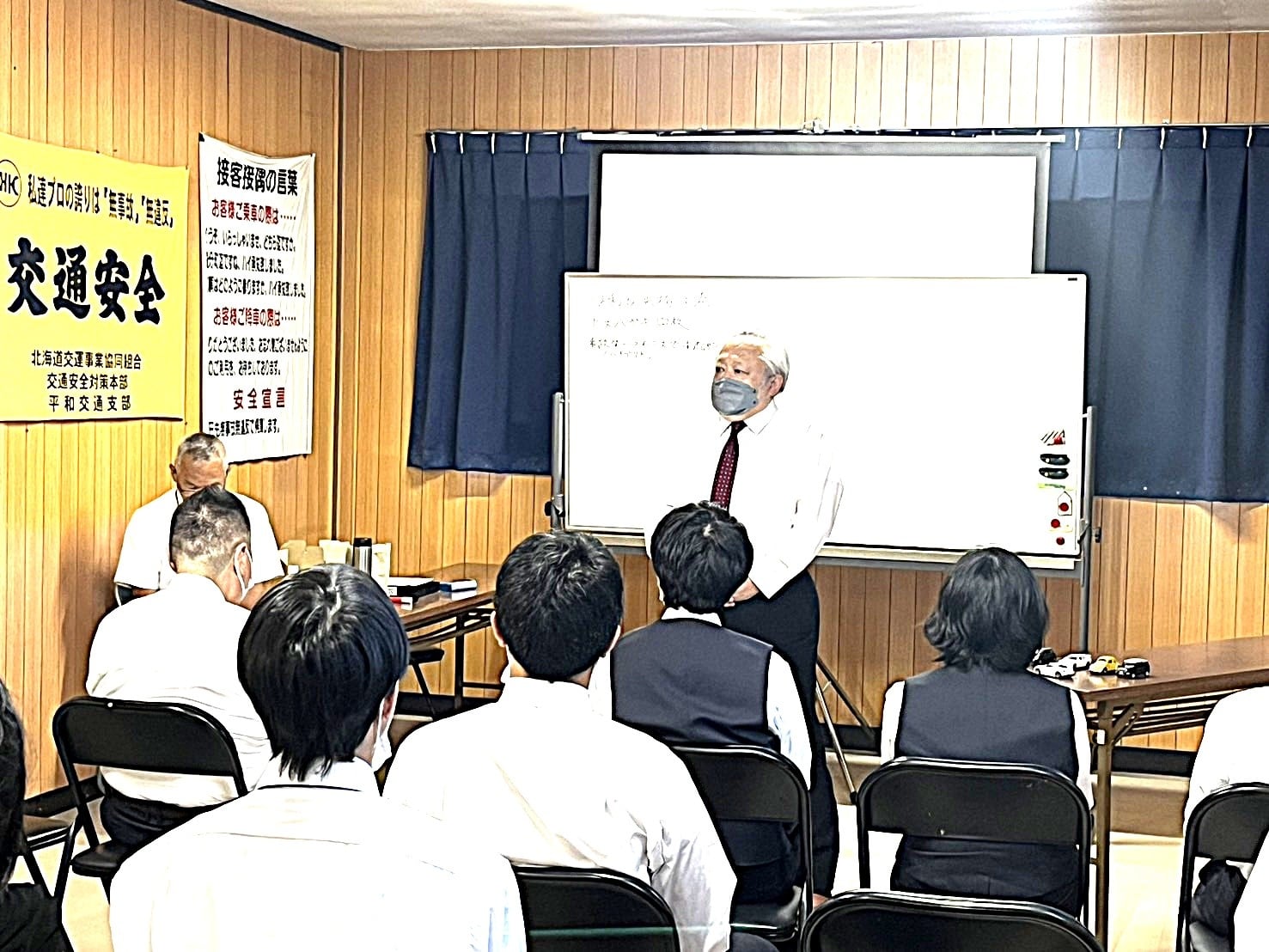 平和交通 - 当地社区和活动照片外部讲师举办“力争零事故”研讨会 返回列表2025.6/18 重新检查你的驾驶平和交通邀请外部讲师举办了以实现零交通事故为目标的研讨会。这是一次非常有益的讲座,不仅涉及出租车司机所需的技能,还涉及汽车的特点和驾驶操作。本次的讲师是布莱恩斯赛车俱乐部国内A级球场裁判高桥正夫先生