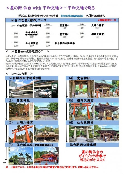 平和×星的街仙台・1.仙台六芒星路線仙台星之城×和平交通仙台卦(界)路线 返回列表仙台六芒星(结界)课程(4小时私人课程)仙台卦(结界)课程 <所需时间>约4小时<旅游行程>从仙台站和仙台市中心出发↓青叶神社↓大崎八幡宫↓仙台城本丸(宫城护国神社)↓爱宕神社↓辻丘天满宫↓仙台东照宫↓到仙台站和仙台市中心<价格>普通车25,600日元 预订和信用卡支付巨型 ¥39,040