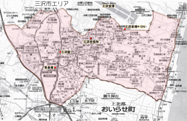 主要城镇名称 | 犬落濑堀切沢、字古间木山、荣町、大町2丁目、中央町、樱町、泉町、松园町、幸町、绿町、冈三泽、美野原、日之出、深谷、前平、南山、东冈三泽、大三泽上屋敷、大字三泽横泽、大字三泽之神、大字三泽中平(根据地区地图) |