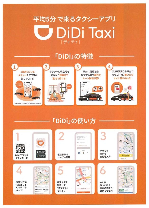 平和交通 - 出租车应用程序“DiDi”和平交通介绍!请使用平均5分钟到达的打车软件“滴滴”!出租车调度应用程序您现在可以使用调度应用程序 DiDi。2023-04-01感谢您一直使用平和交通。Heiwa Kotsu 现在可以使用调度应用程序 DiDi。只有部分车辆可能无法立即接您。感谢您的理解。叫车应用滴滴是什么?对于那些说,从下面的网址!https://didimobility.co.jp/宫城地区的计程车应用程序“滴滴”扩充~4月开始导入“平和交通”~