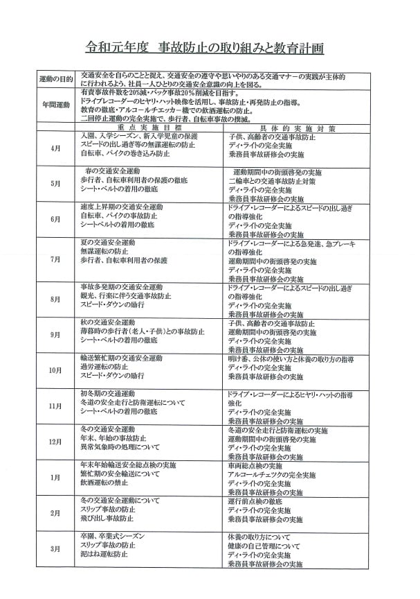 通过稳步制定、实施、检查和改进运输安全(Plan Do Check Act),不断审查安全措施,全体员工齐心协力,各司其职,从而不断改进运输。我们还将积极公开交通安全信息。