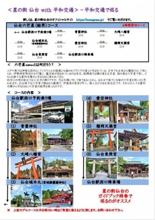 平和×星的街仙台・1.仙台六芒星路線仙台星之城×和平交通仙台卦(界)路线 仙台六芒星(结界)课程(4小时私人课程)仙台卦(结界)课程 <所需时间>约4小时<旅游行程>从仙台站和仙台市中心出发↓青叶神社↓大崎八幡宫↓仙台城本丸(宫城护国神社)↓爱宕神社↓辻丘天满宫↓仙台东照宫↓到仙台站和仙台市中心<价格>普通车25,600日元 预订和信用卡支付巨型 ¥39,040 返回列表分享