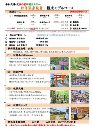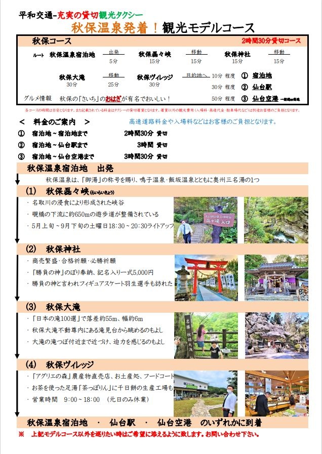 北海道交运事业协同组合的和平交通 - 秋保温泉的到达和离开!观光示范课程页面每门课程的信息 秋保温泉出发/到达 秋保路线(2小时30分钟~私人路线)秋保温泉出发/到达的路线 <所需时间>约2小时30分钟~<旅游行程>秋保温泉住宿出发↓秋保来来峡↓秋保神社↓秋保瀑布↓秋保村↓秋保温泉住宿、仙台站、仙台机场<价格>标准车 2小时30分钟包车到秋保温泉住宿 16,000 日元 预订和信用卡支付3小时包车到仙台站 19,200 日元 预订和信用卡支付3小时30分钟包车到仙台机场 22,400 日元 预订和信用卡支付 大型 2小时30分钟包车到秋保温泉住宿 24,400 日元 3小时包车到仙台站 29,280 日元 3小时30分钟包车到仙台机场 34,160 日元 返回列表分享