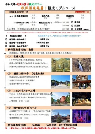 北海道交运事业协同组合的和平交通 - 秋保温泉的到达和离开!观光示范课程页面每门课程的信息 秋保温泉出发/到达 秋保全程路线(5小时~私人路线)秋保全套餐 <所需时间>约5小时<旅游行程>秋保温泉住宿出发↓秋保瀑布↓极乐山西宝寺(定义如来)↓日华威士忌工厂↓锦冈山坡购物中心↓秋保温泉住宿、仙台站、仙台机场<价格>标准车 5小时包机 到秋保温泉住宿 32,000 日元 预订和信用卡支付5小时30分钟包车 到仙台站 35,200 日元 预订和信用卡支付6小时包机 前往仙台机场 38,400 日元 预订和信用卡支付 大型 5小时包机 到秋保温泉住宿 48,800 日元 5小时30分钟包车 到仙台站 53,680 日元 6小时包机 前往仙台机场 58,560 日元 返回列表分享