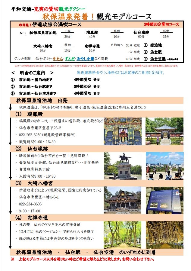 北海道交运事业协同组合的和平交通 - 秋保温泉的到达和离开!观光示范课程页面每门课程的信息 伊达政宗享受路线(3小时30分钟~私人路线)从秋保温泉出发到达伊达政宗享受秋保温泉往返路线 <所需时间>约3小时30分钟~<旅游行程>秋保温泉住宿出发↓瑞凤殿↓仙台城迹↓大崎八幡宫↓定禅寺街↓秋保温泉住宿、仙台站、仙台机场<价格>标准车 4小时包机 到秋保温泉住宿 25,600 日元 预订和信用卡支付3小时30分钟包车 到仙台站 22,400 日元 预订和信用卡支付4小时包机 前往仙台机场 25,600 日元 预订和信用卡支付 大型 4小时包机 到秋保温泉住宿 39,040 日元 3小时30分钟包车 到仙台站 34,160 日元 4小时包机 前往仙台机场 39,040 日元 返回列表分享