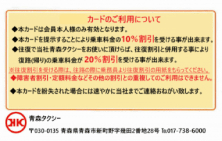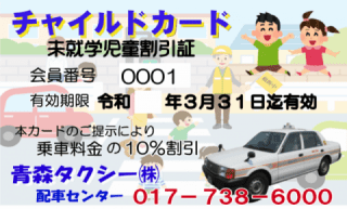 超值折扣 | 育儿支援/儿童(学龄前)折扣 | 青森出租车婴儿(学龄前儿童)折扣 | 育儿支持折扣儿童(婴儿/学龄前儿童)卡儿童卡(样本)儿童(学龄前儿童)折扣卡(背面)从网上轻松申请 “HK TAXI”出租车调度应用程序 儿童折扣卡申请电话:017-738-9977030-0135青森县青森市新町野字几田 2-28东京太阳股份有限公司青森出租车事务所 ℡017-738-9977 传真017-738-6121 青森出租车股份有限公司主页 生育折扣页面