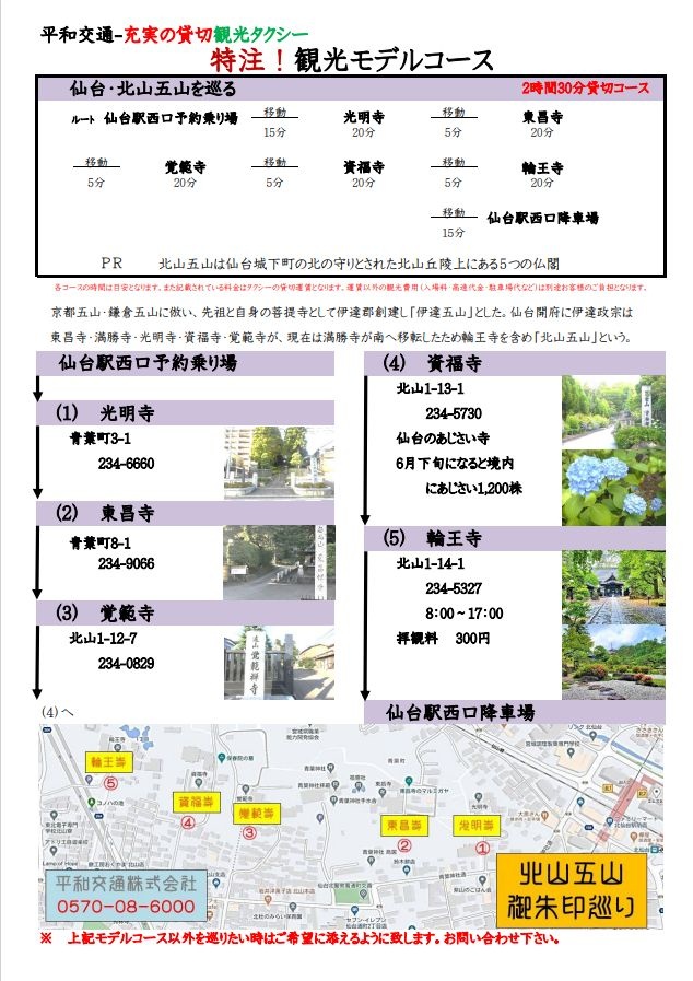 北海道交运事业协同组合的平和交通 - 特别订购!观光示范课程页面短途旅行! 游览仙台、北山五山(2小时30分钟包车路线)游览仙台和北山五山 <所需时间>约2小时30分钟<旅游行程>从仙台站西口出租车预约处出发↓光明寺↓东胜寺↓觉分寺↓始福寺↓轮王寺↓到仙台站<价格>普通车16,000日元 预订和信用卡支付巨型 ¥24,400 *祭祀费、红印费等费用由客户承担。 返回列表分享