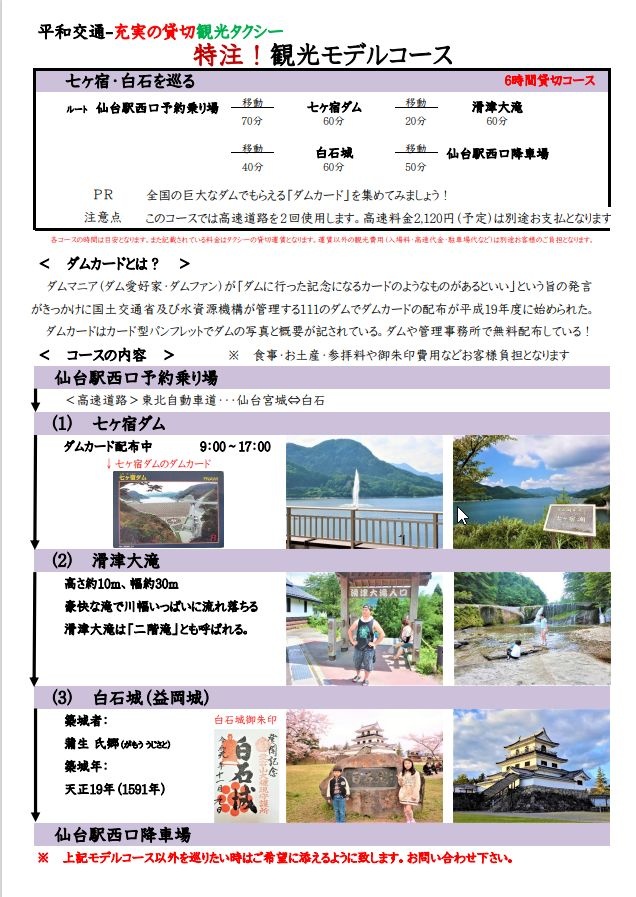 北海道交运事业协同组合的平和交通 - 特别订购!观光示范课程页面短途旅行! 七宿、白石周边游览(6小时私人路线)游览七宿和白石 <所需时间>约6小时<旅游行程>从仙台站西口出租车预约处出发↓七宿水坝↓名津瀑布↓白石城(增冈城)↓到仙台站<价格>普通车38,400日元 预订和信用卡支付巨型 ¥58,560 *本课程两次使用高速公路。高速公路费 2 日元(计划中)将单独收取。*餐费、纪念品、入场费和红印费等费用由客户承担。 返回列表分享