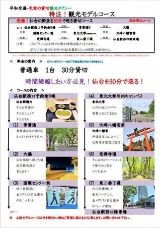 北海道交运事业协同组合的平和交通 - 特别订购!观光示范课程页面每门课程的信息 最终的! 30分钟带您游览仙台街道的私人路线*从火车窗口最终的!带您穿越仙台街道的30分钟包场路线 <所需时间>约30分钟<旅游行程>从仙台站西口出租车预约处出发↓青叶通↓大桥↓国际中心前↓东北大学河内校区↓大崎八幡宫前↓定禅寺街↓东二番町通↓到仙台站<价格>普通车3,200日元 预订和信用卡支付 *本课程只能乘坐出租车绕市中心。*本课程不设置在每个地点停留的时间限制。此时只有指导和摄影的时间。*本课程不接受大型出租车的预订。返回列表分享