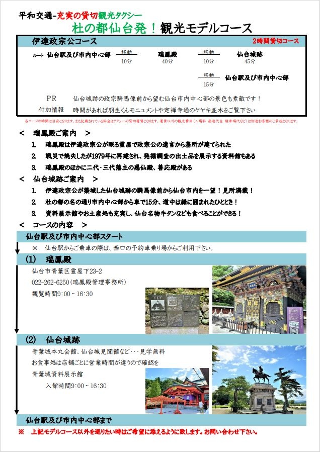 北海道交运事业协同组合的和平交通 - 从树木之城仙台出发!观光示范课程页面每门课程的信息 伊达政宗课程(2小时私人课程)伊达政宗套餐 <所需时间>约2小时<旅游行程>从仙台站和仙台市中心出发↓瑞凤殿↓仙台城迹↓到仙台站和仙台市中心<价格>普通车12,800日元 预订和信用卡支付巨型 ¥19,520 返回列表分享