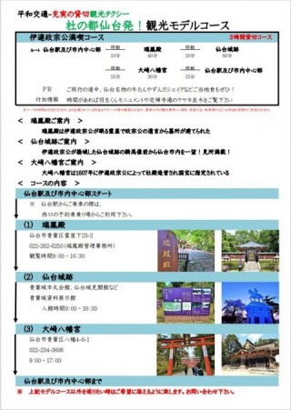 北海道交运事业协同组合的和平交通 - 从树木之城仙台出发!观光示范课程页面每门课程的信息 伊达政宗享受课程(3小时私人课程)伊达政宗享受套餐 <所需时间>约3小时<旅游行程>从仙台站和仙台市中心出发↓瑞凤殿↓仙台城迹↓大崎八幡宫↓到仙台站和仙台市中心<价格>普通车19,200日元 预订和信用卡支付巨型 ¥29,280 返回列表分享